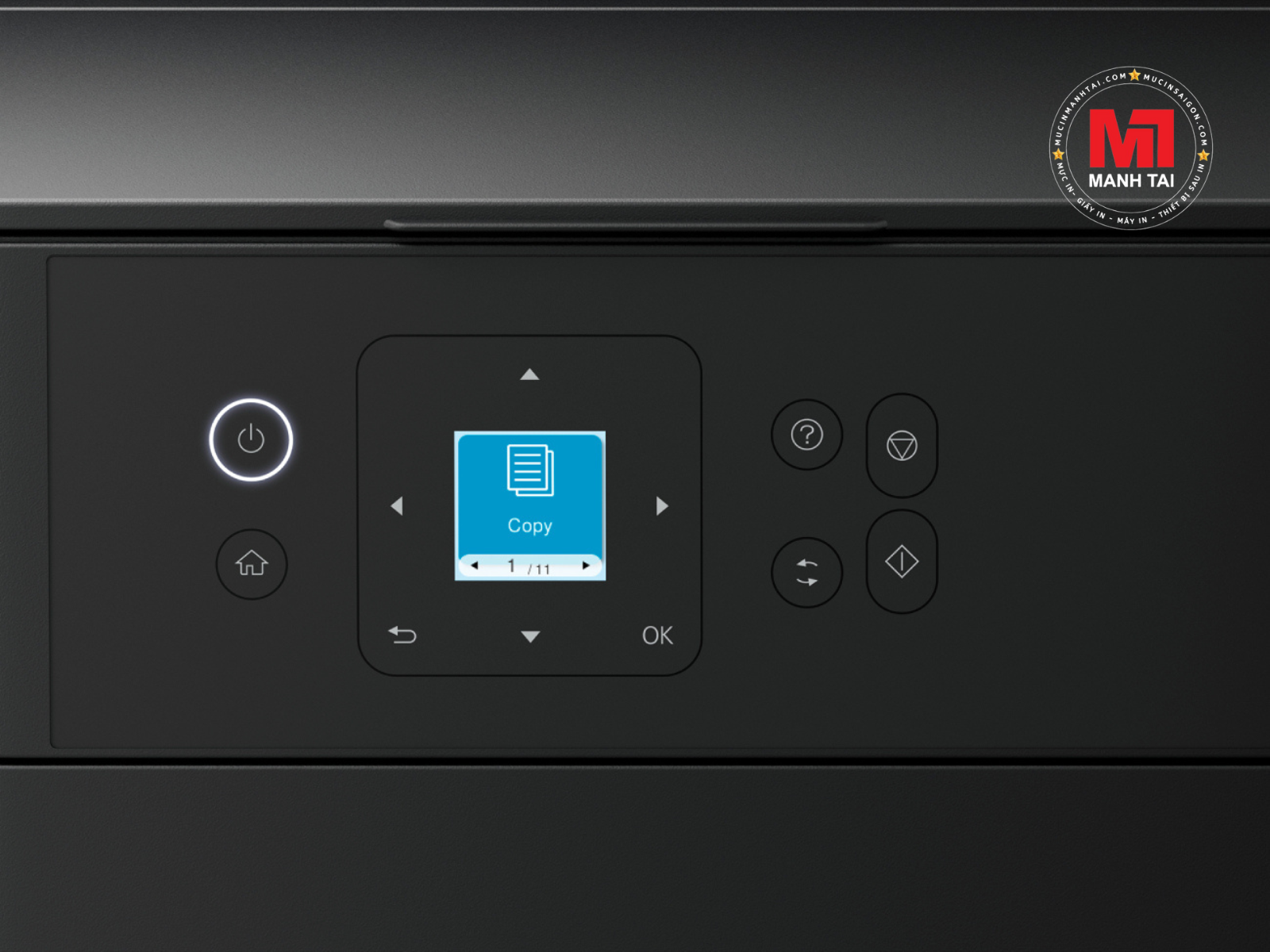 Bảng điều khiển được bố trí trực quan, nút bấm phản hồi nhanh, màn hình LCD hiển thị rõ ràng giúp người dùng dễ theo dõi trạng thái in, lượng mực và thiết lập các tác vụ in ấn cơ bản.
